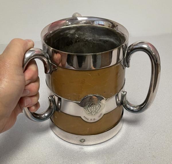 19th century English champagne bucket made from Sheffield silver, leather and wood in the early Arts and Crafts style. Monogrammed "From R. B. 1886". Measures 7 inches tall, 6 inches wide at the base and 5 inches wide at the top with a 4.5 inch wide opening. Excellent original condition.