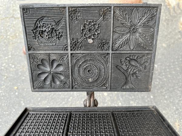 SOLD ITEM 11847 - 19thc German cast iron waffle press for hearth cooking