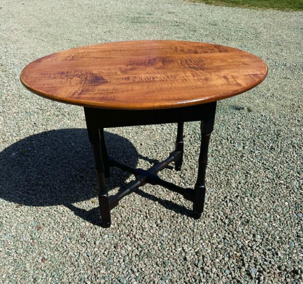SOLD ITEM 11859 - D R Dimes tiger maple round table on black base