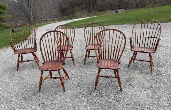 Set of six D. R. Dimes Windsor chairs, two arms and . . .