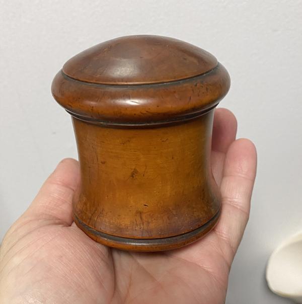 Antique pearwood treenware covered apothecary container . . .